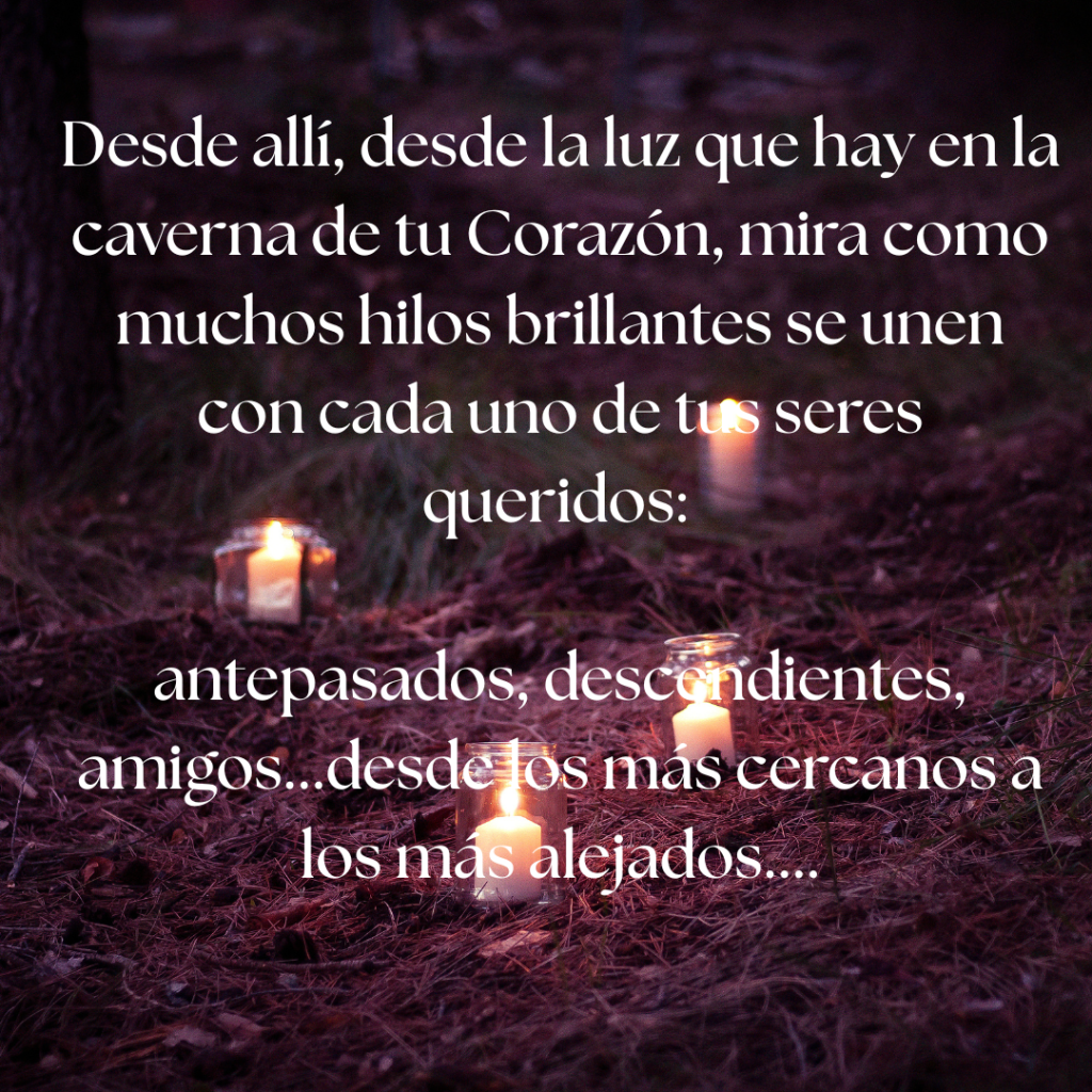 Des d’allà, des de la llum que hi ha a la caverna del teu Cor, mira com tot de fils brillants s’enllacen amb cadascun dels teus éssers estimats, avantpassats, descendents, amics…des dels més propers fins als més llunyans.
